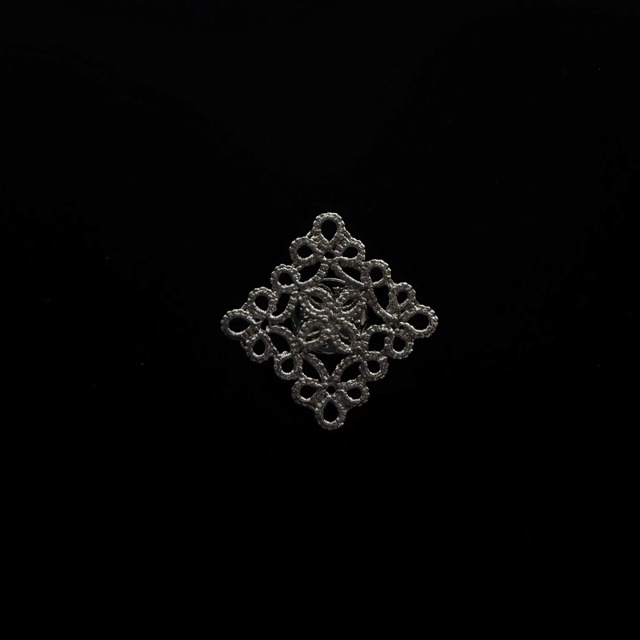 Yularice Lace brooch Square Brass 手編みのオリジナルレースを 糸の持つ細やかな質感はそのままに金属に鋳造しています。 とても細かく編み目が写し取られているため 糸を何かでコーティングしていると思われることも多いのですが 中に糸は入っておらず完全にシルバーに置き換わっています。 大きな四角のタティングレースが存在感のあるデザイン ブローチ金具はタックピン型になっています。 素材: モチーフ 真鍮 ブローチ金具 洋白 真鍮メッキ サイズ:2.5cm×2.5cm ※繊細なデザインの特性上強い力がかかると変形や破損する恐れがあります。 お取り扱いには十分にご注意ください。。