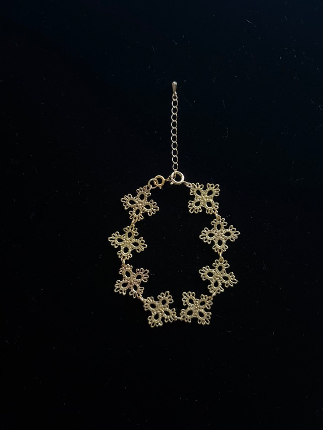 Yularice Waltz circular bracelet Brass 手編みのオリジナルレースを 糸の持つ細やかな質感はそのままに金属に鋳造しています。 かなり細かく編み目が写し取られているため 糸を何かでコーティングしていると思われることも多いのですが 中に糸は入っておらず完全に真鍮に置き換わっています。 半円状のモチーフを一つ一つ繋げた華やかなデザイン。 お出かけの用途はもちろん カジュアルな装いに合わせていただくのもオススメです。 2枚目3枚目画像のように別売りのネックレスやアジャスターチェーンと組み合わせてネックレスにすることも可能です。 素材: Brass サイズ:17cm+5.5cm(取り外し可能アジャスター) ※繊細なデザインの特性上強い力がかかると変形や破損する恐れがあります。 お取り扱いには十分にご注意ください。