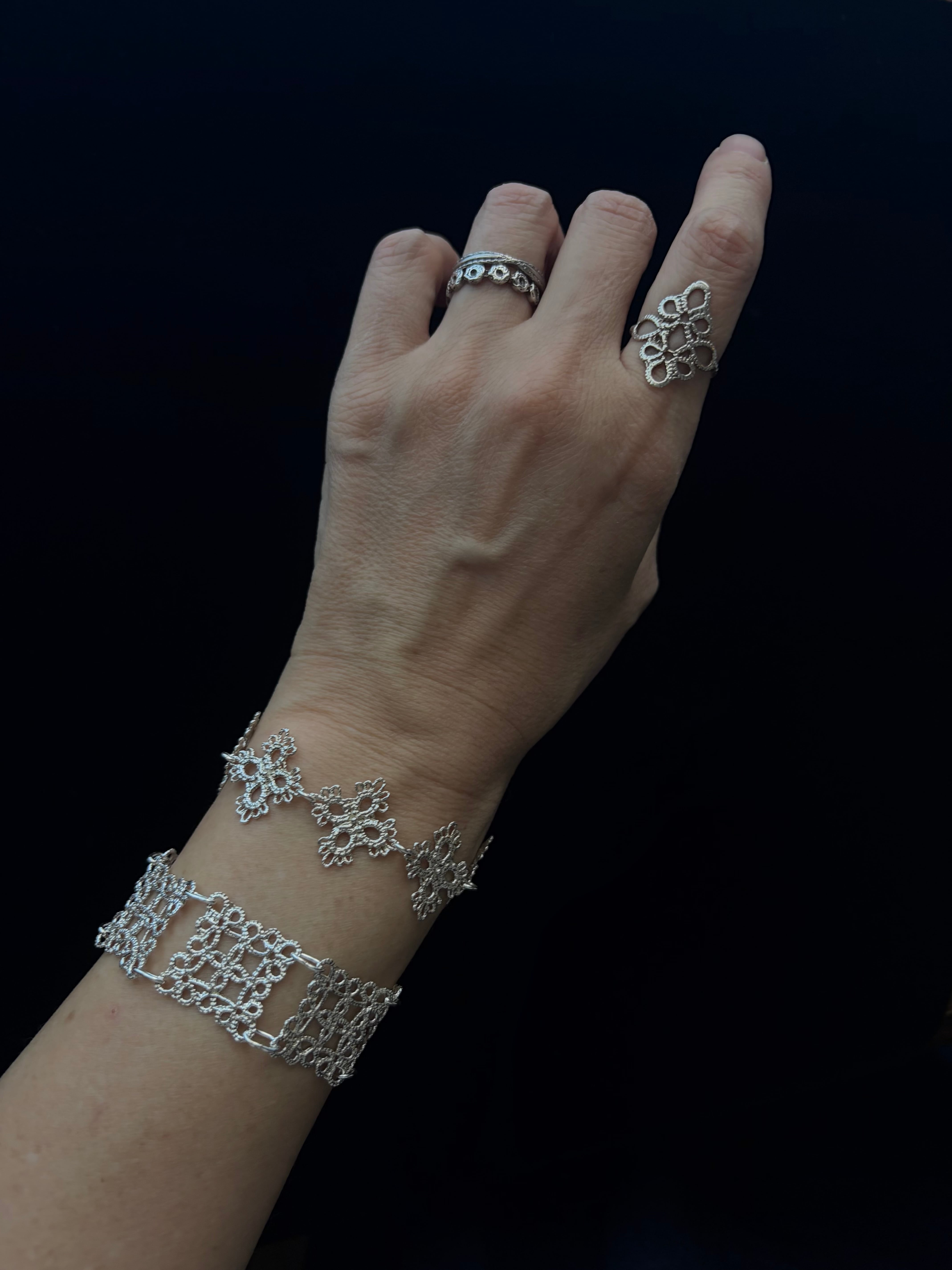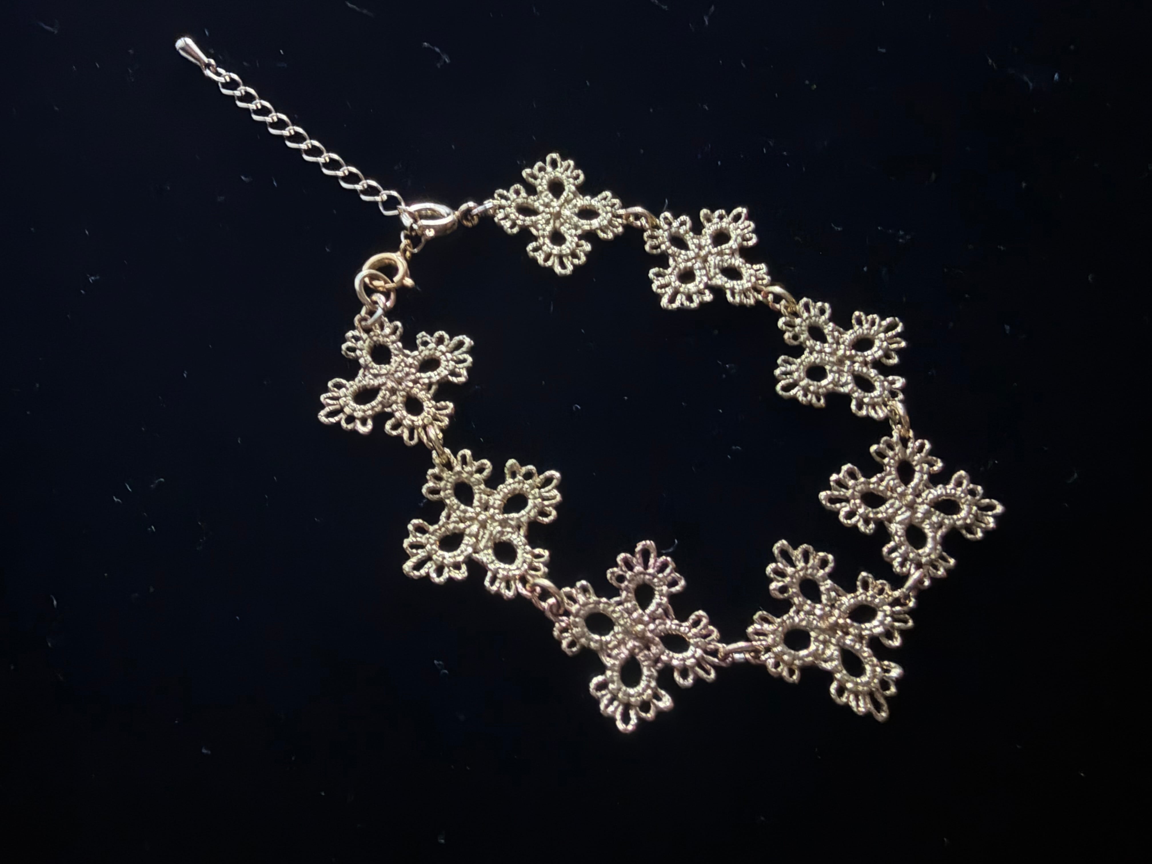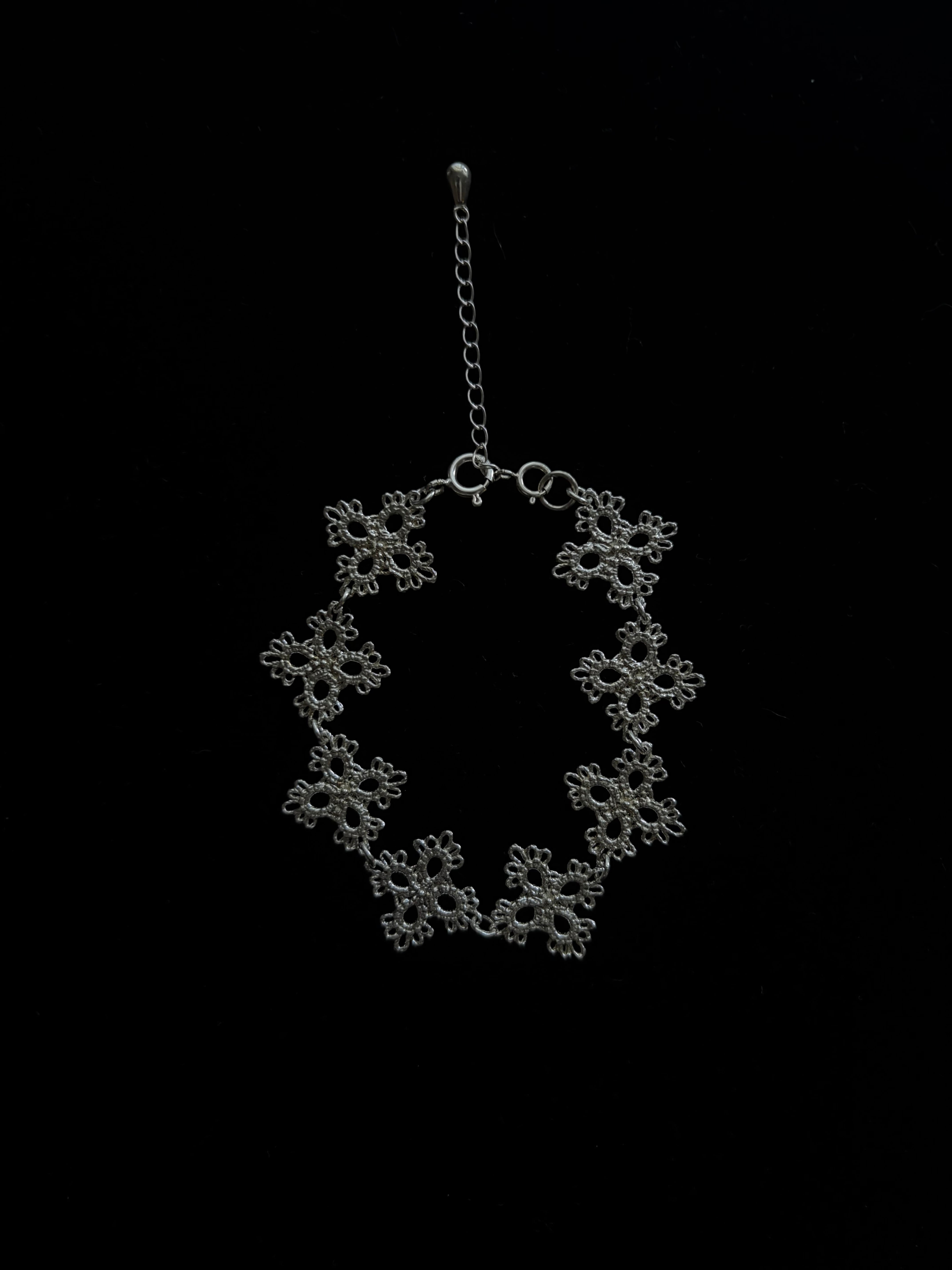 繊細なタティングレースを繋げた存在感のあるデザインです。