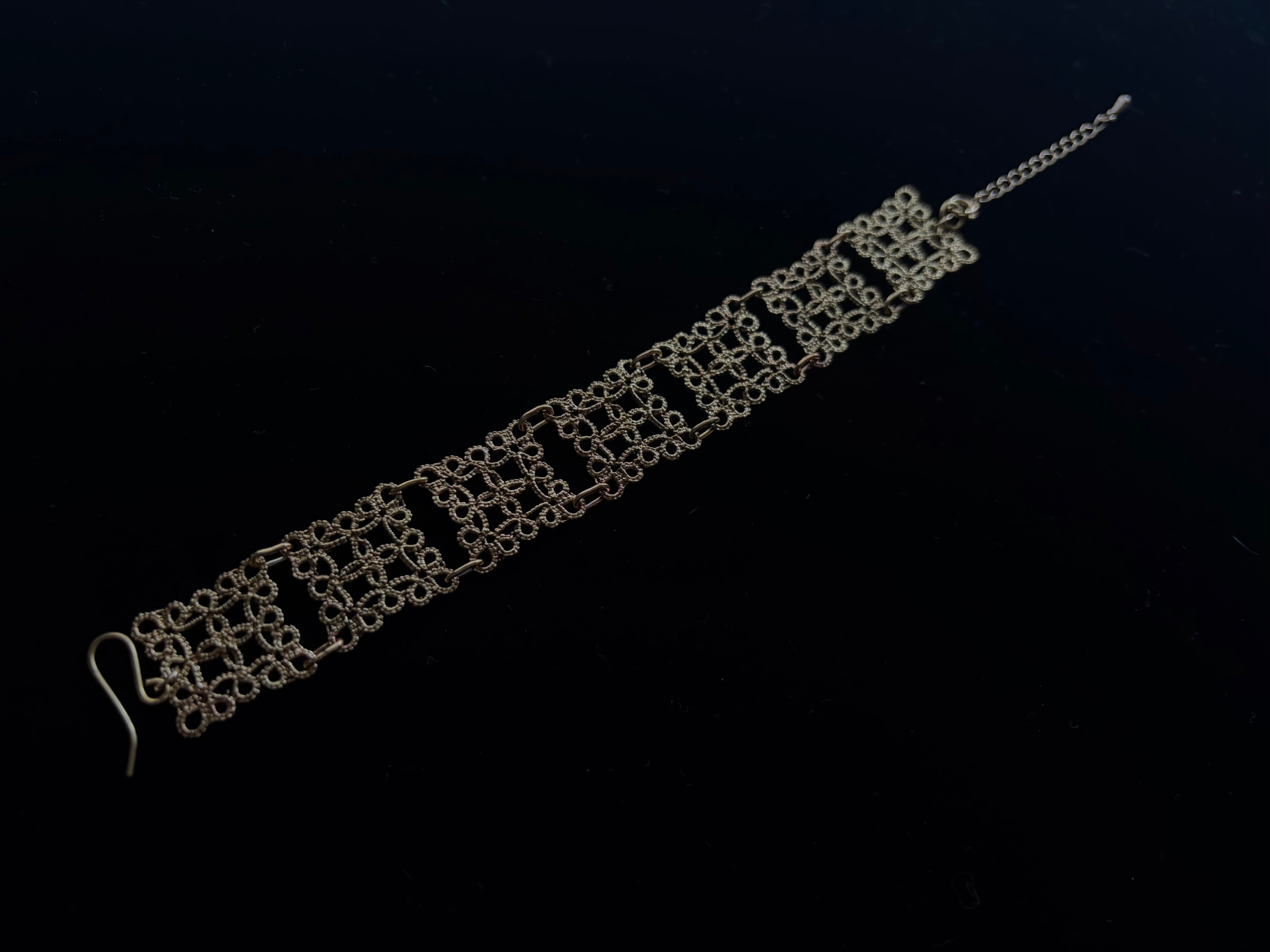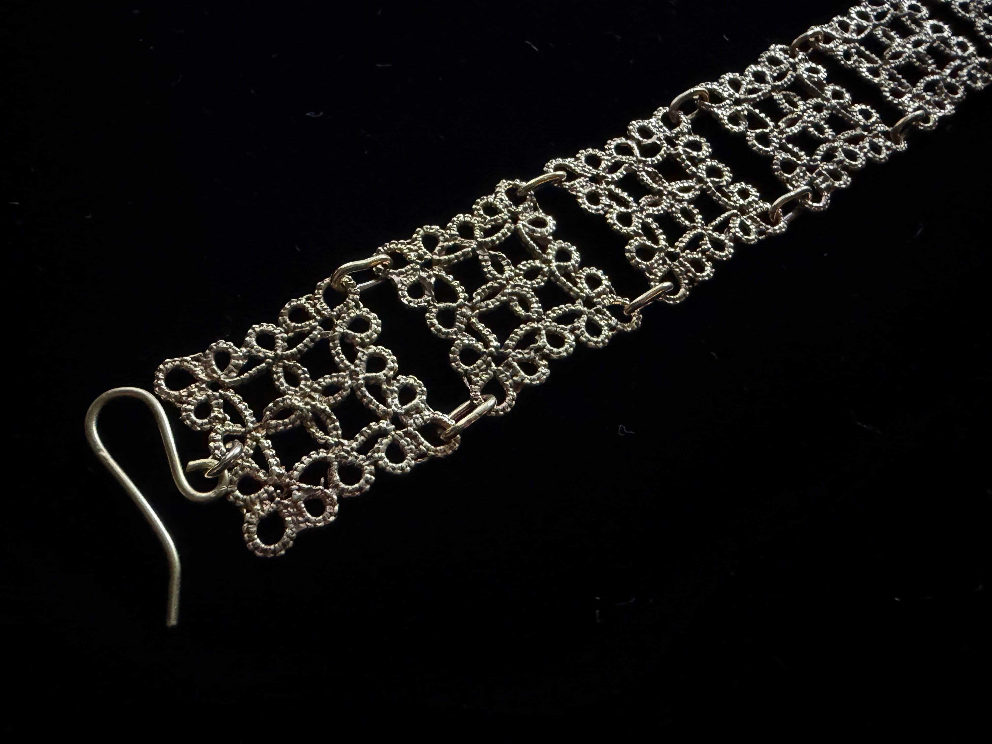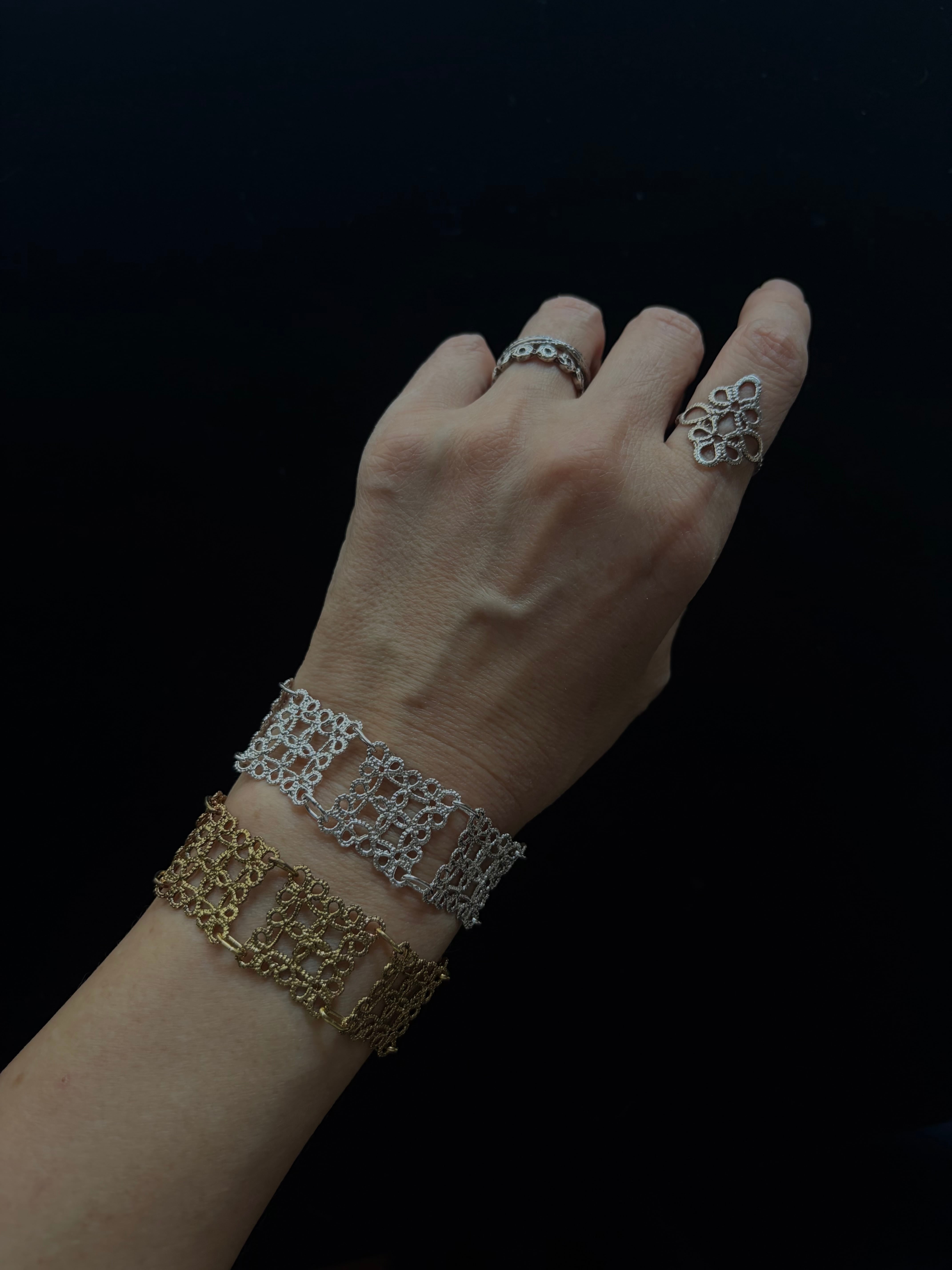 繊細なタティングレースを帯状に繋げた存在感のあるデザインです。