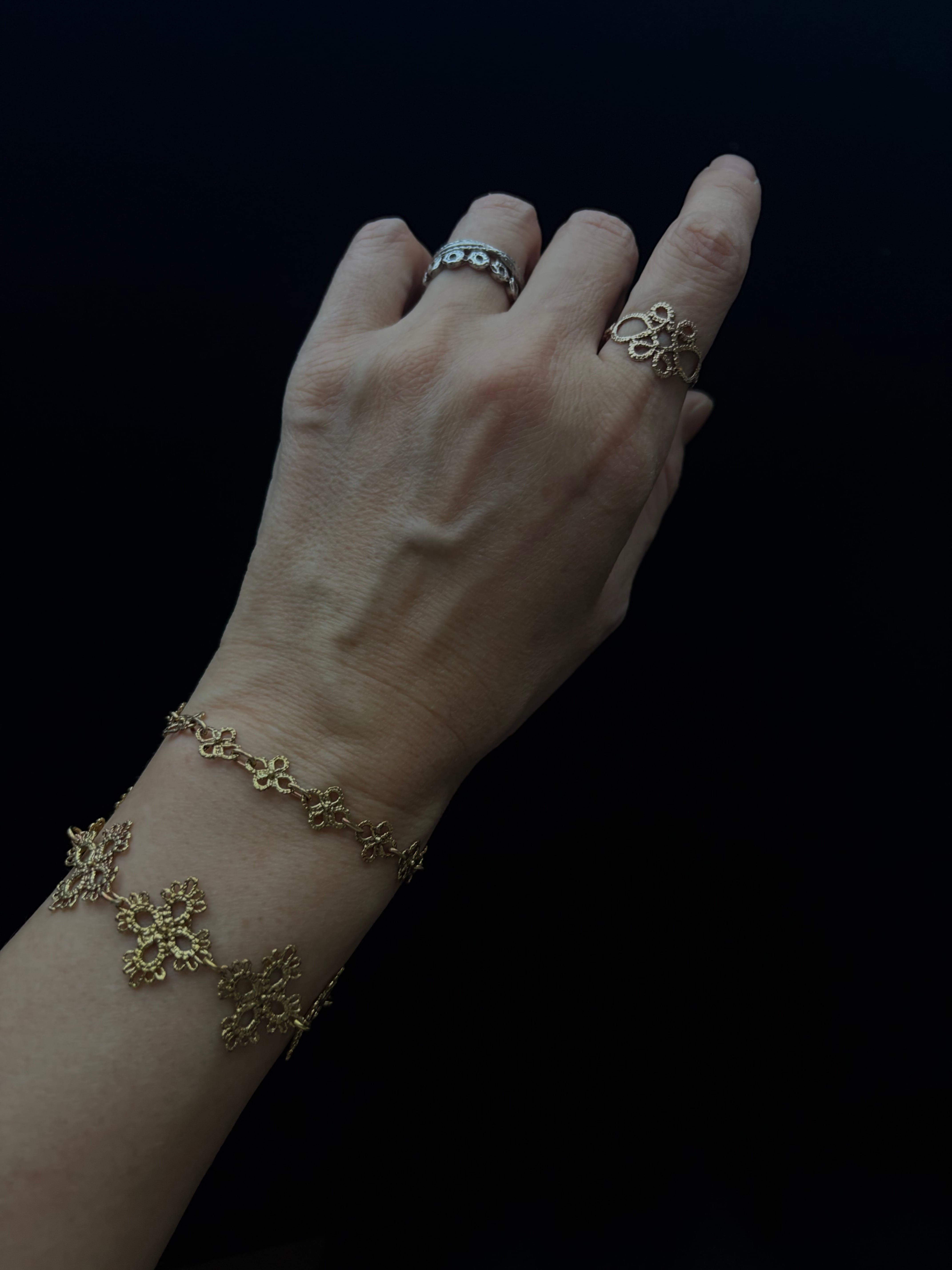 繊細なタティングレースを繋げた存在感のあるデザインです。