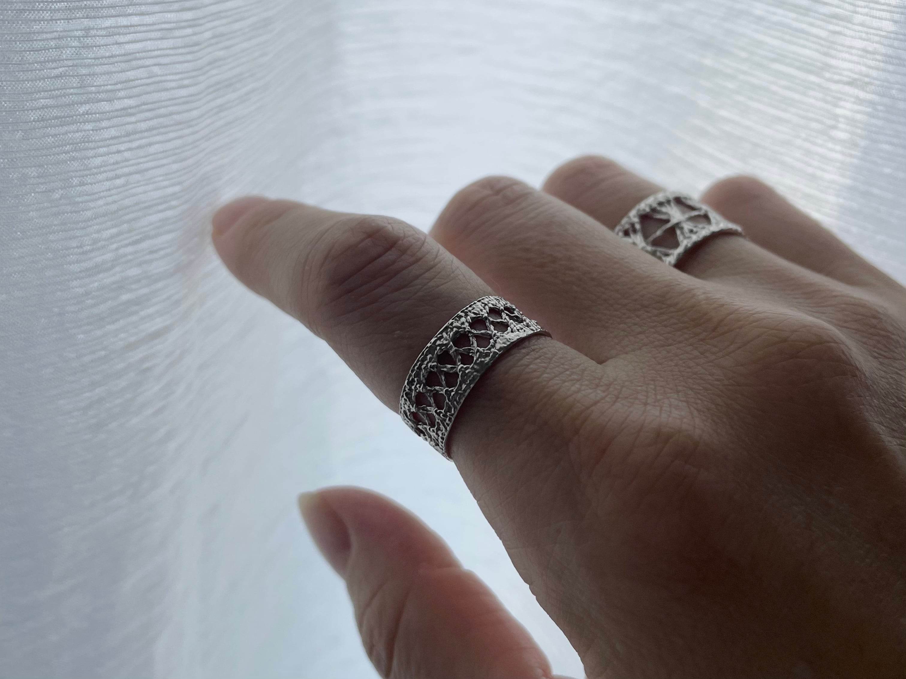 一方レースを指に巻きつけたように見えるリングやピアスは自らの手で編んだレースを原型にして金属に鋳造したもの。